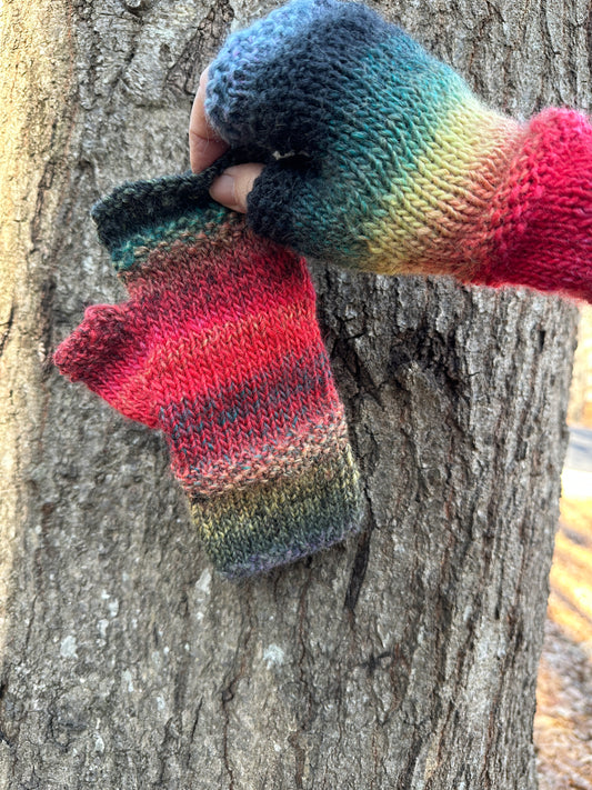 Fingerless Gloves, Hand Painted Wool, Hand Knit in Rainbow colors