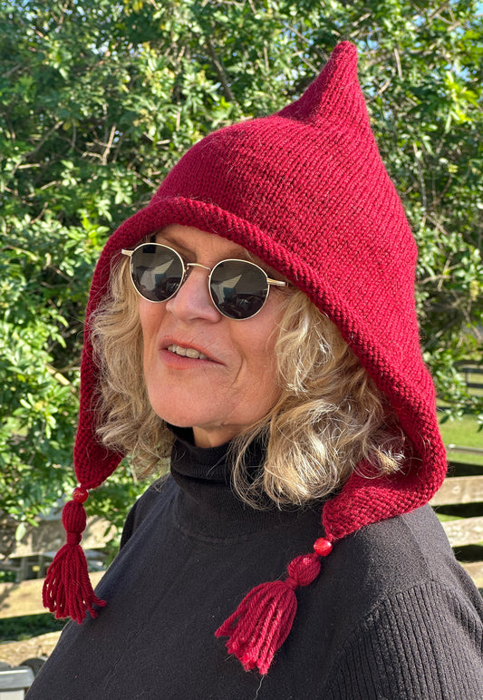 Dark Red Pixie Hood, Hand Knit in Wool