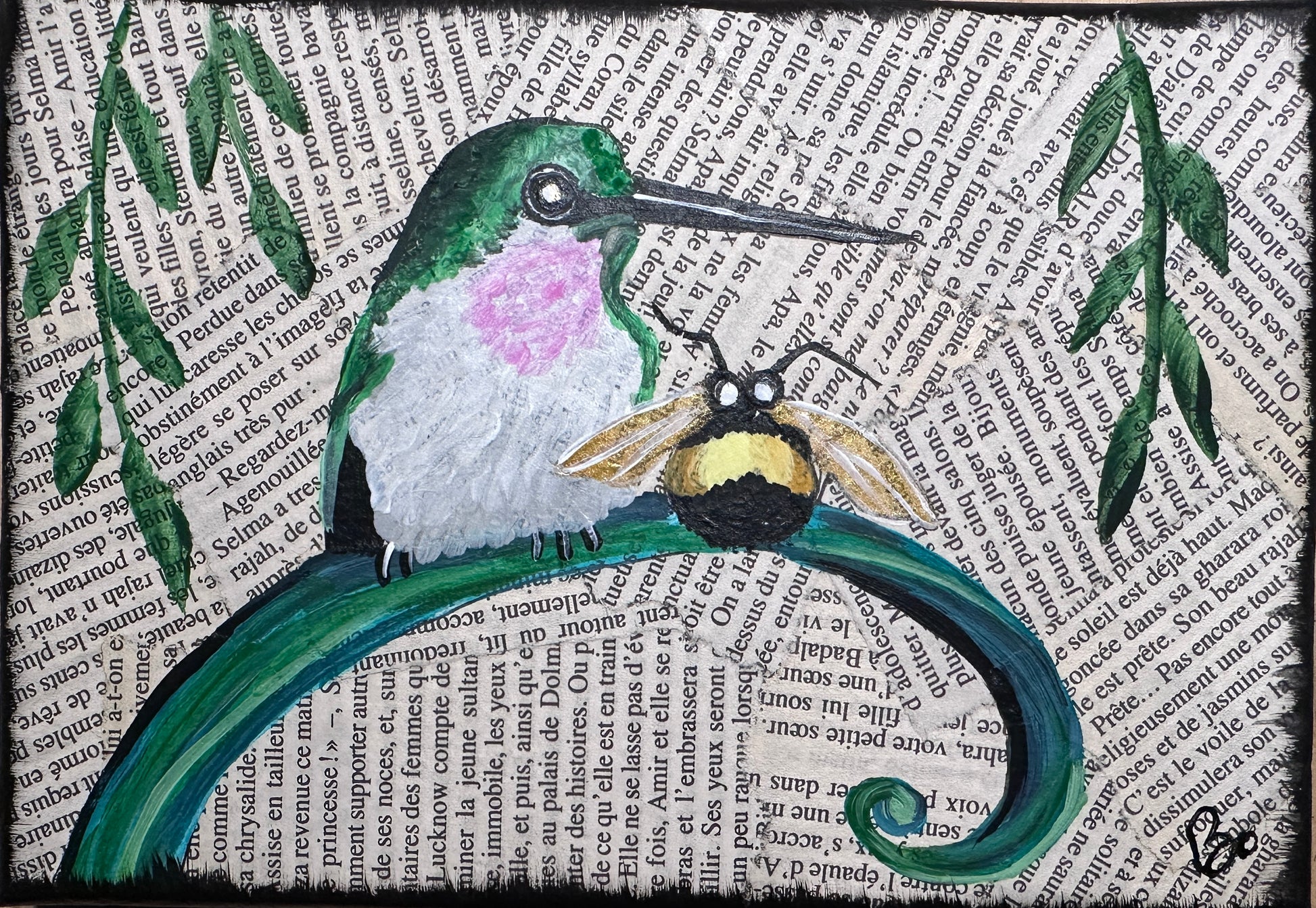 I decoupaged a 5x7 inch canvas with pages from a French novel. Then I painted a hummingbird with a little bee friend in acrylic. Perfect for a nursery or small wall space with a sweet rendering of a bird and a bee.